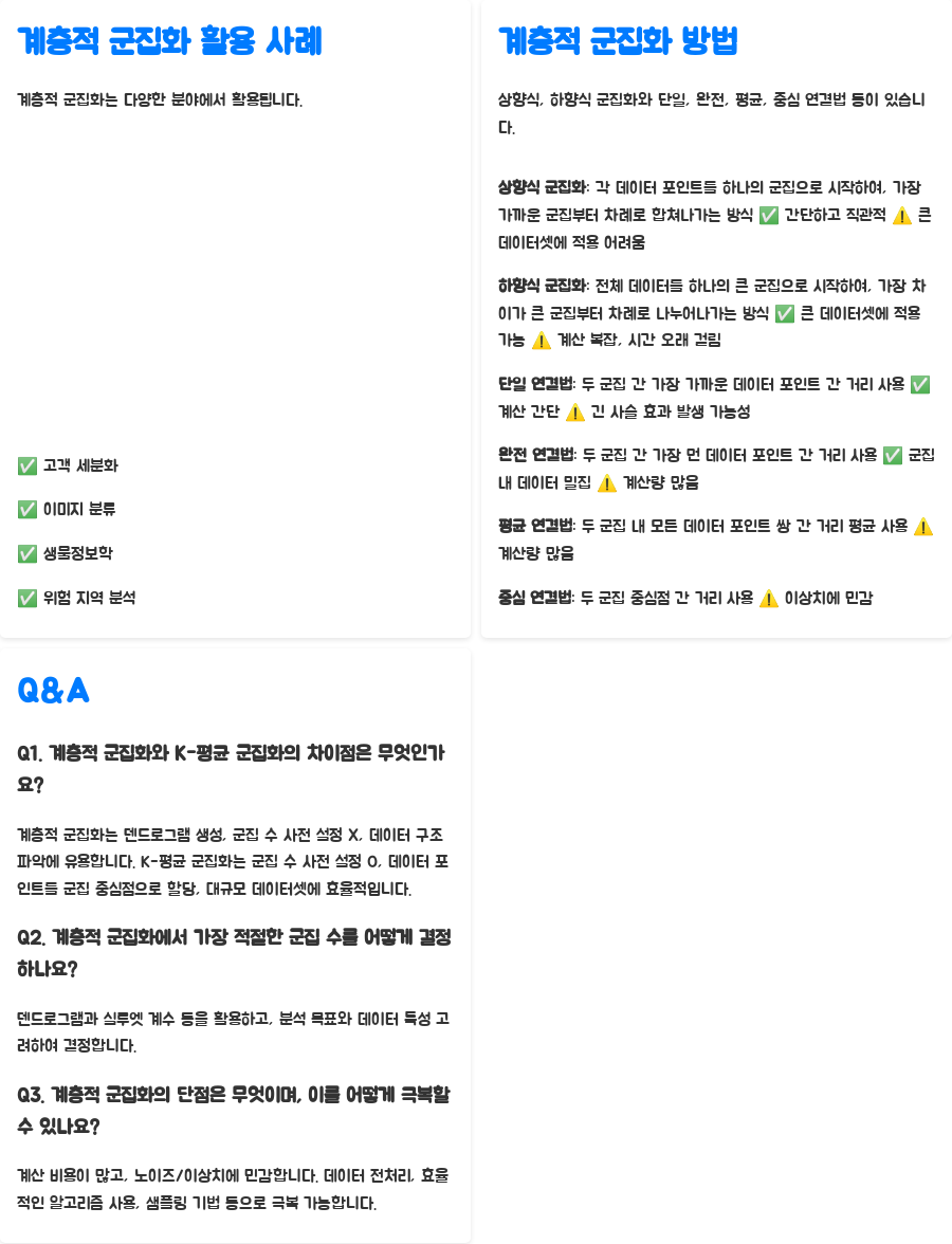 | 상향식 군집화 | 각 데이터 포인트를 하나의 군집으로 시작하여, 가장 가까운 군집부터 차례로 합쳐나가는 방식 | 계산이 간단하고 직관적 | 큰 데이터셋에 적용하기 어려움 |