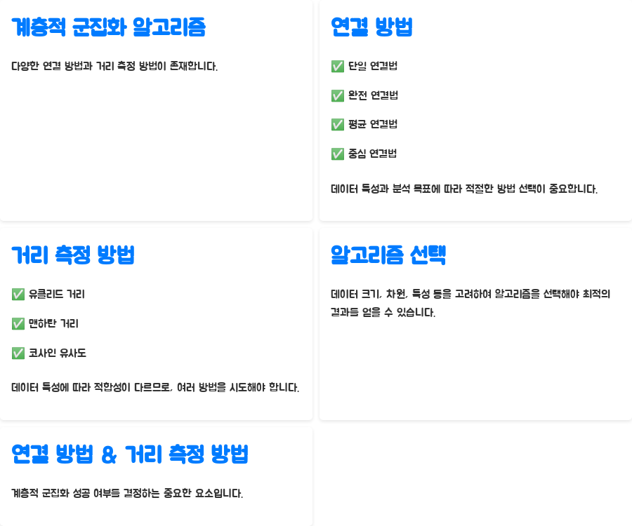 이처럼 연결 방법과 거리 측정 방법을 적절히 선택하는 것은 계층적 군집화의 성공 여부를 결정짓는 중요한 요소입니다.